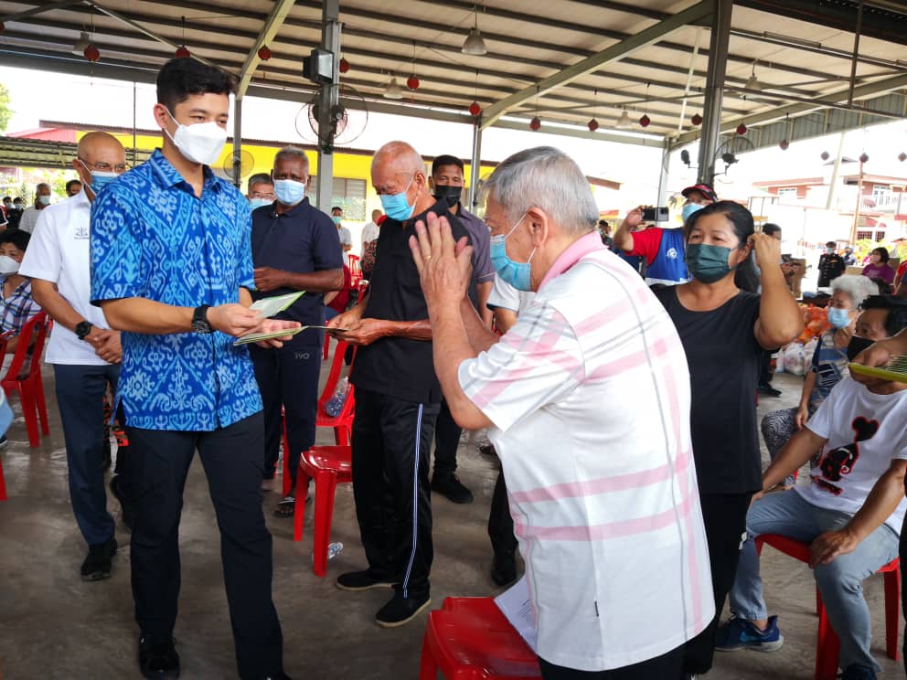 他派发每户灾民两个红包,共装有1500令吉。64户分别是56户新村和河仔区的灾民,以及8间老店的业者。