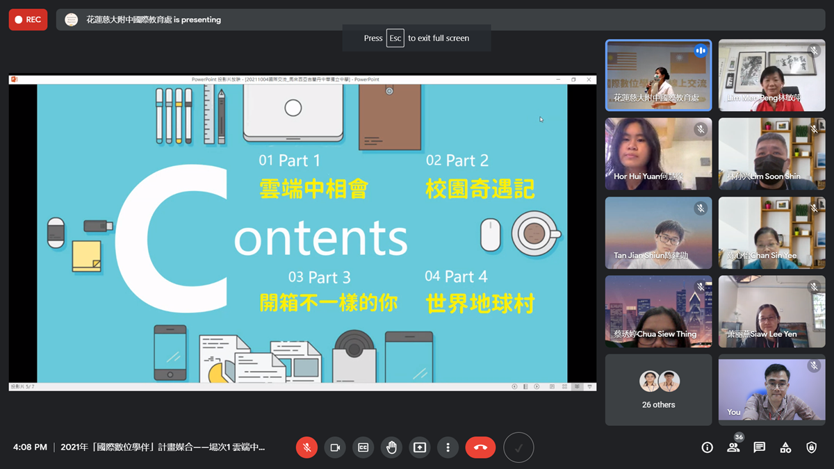他说,为了能引起两校学生对彼此的兴趣和连结,两校特别规划了四场不同主题的课程活动,每周一会,分别有《云端中相会》、《校园奇遇记》、《开箱不一样的你》,而《世界地球村》为该次活动的压轴。