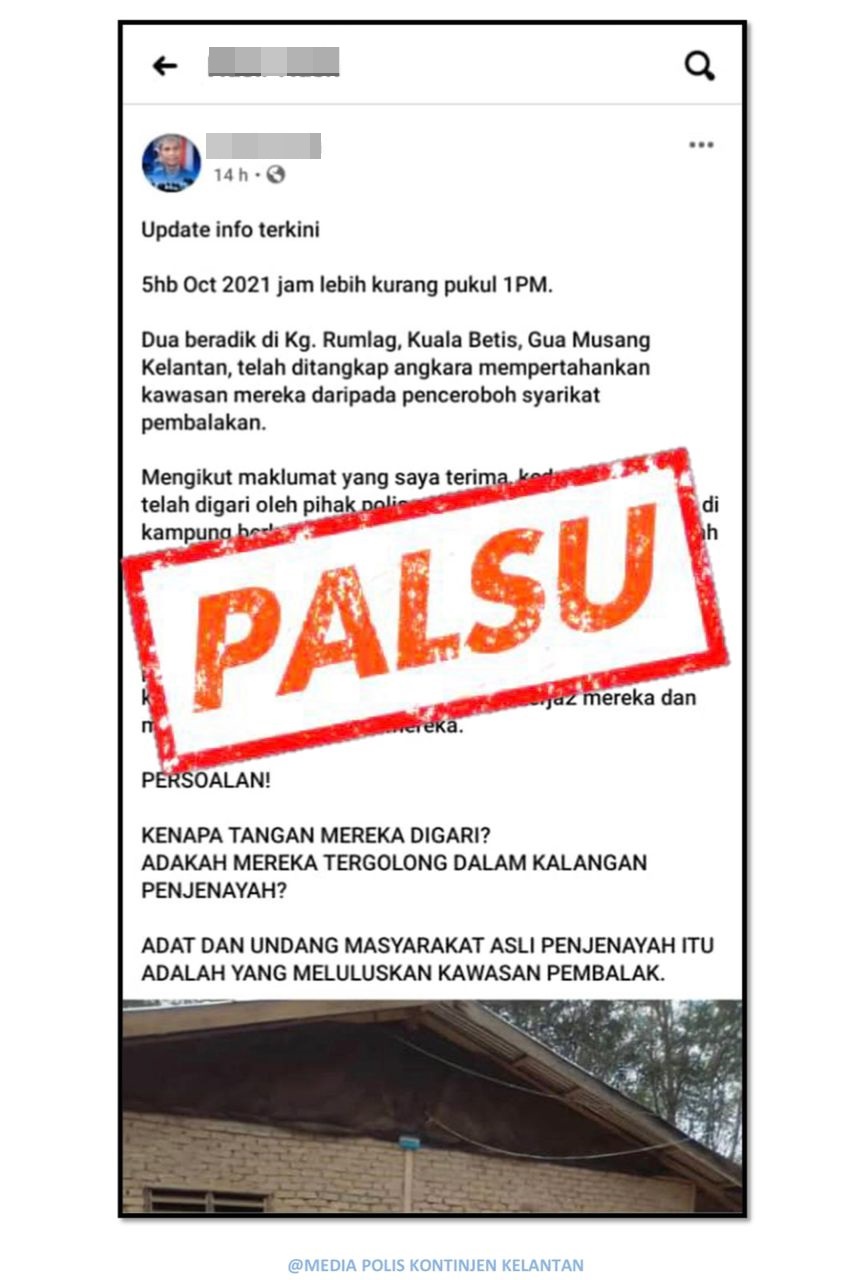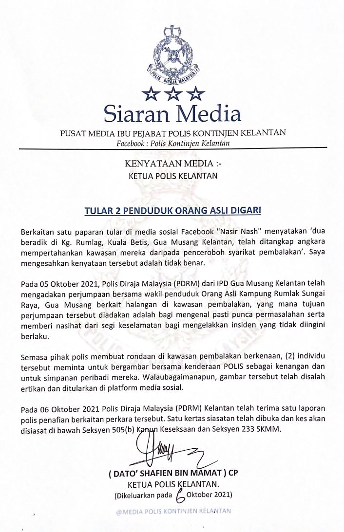 (哥打峇鲁6日讯)吉兰丹州警方声明,原住民社运分子谴责警方,将2名为保护家园和环境的原住民上手铐及带返警局一事,是不实的指控!