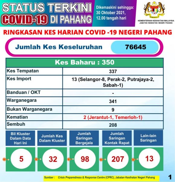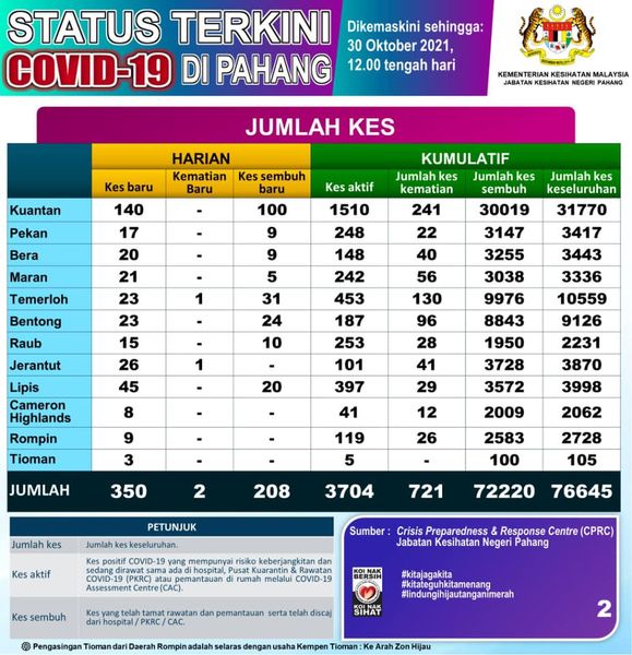 (关丹30日讯)彭亨州确诊冠病病例今天稍微下跌至350宗,2名病患不幸病逝。