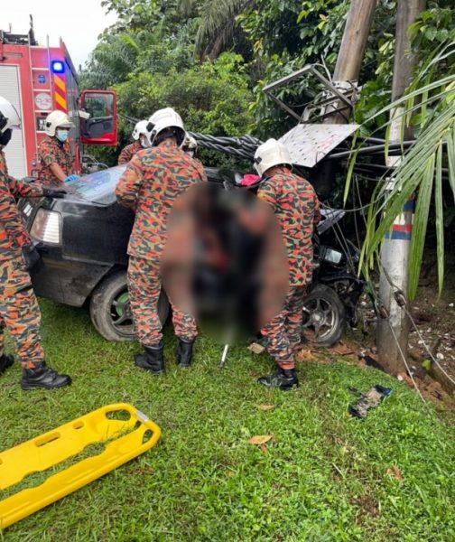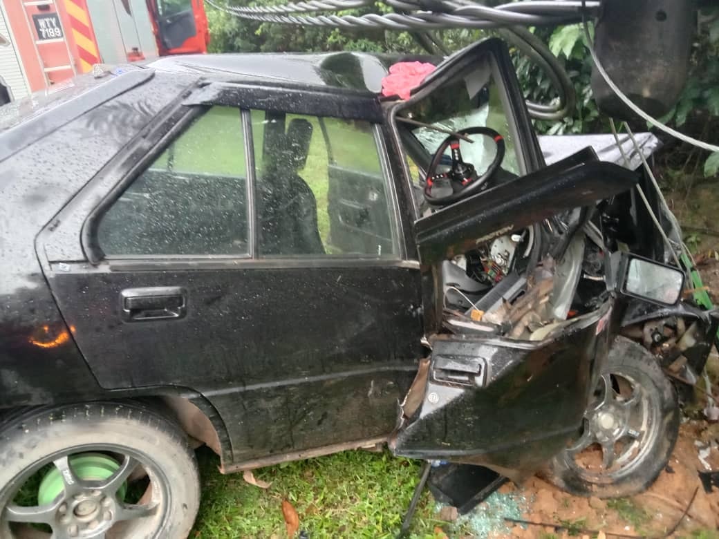 (关丹2日讯)姆阿占沙路往昔加末路发生轿车撞向电灯柱意外,导致2名男子被困在车内动弹不得,珍尼区消拯局及时派员到现场施救,成功把2人救出并送院治疗。
