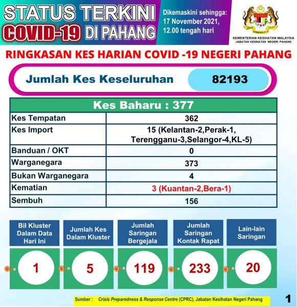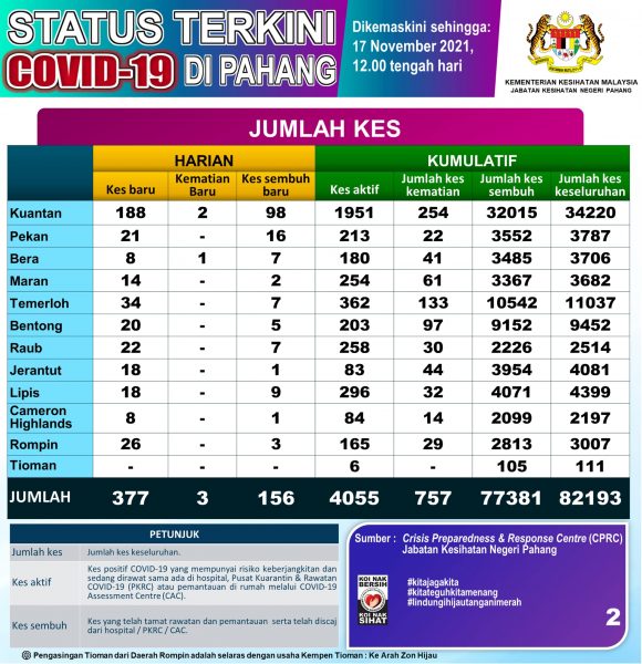 (关丹17日讯)彭亨州今天新增377宗冠病确诊病例,其中关丹县病例最多,占188宗,以及3人不幸逝世。