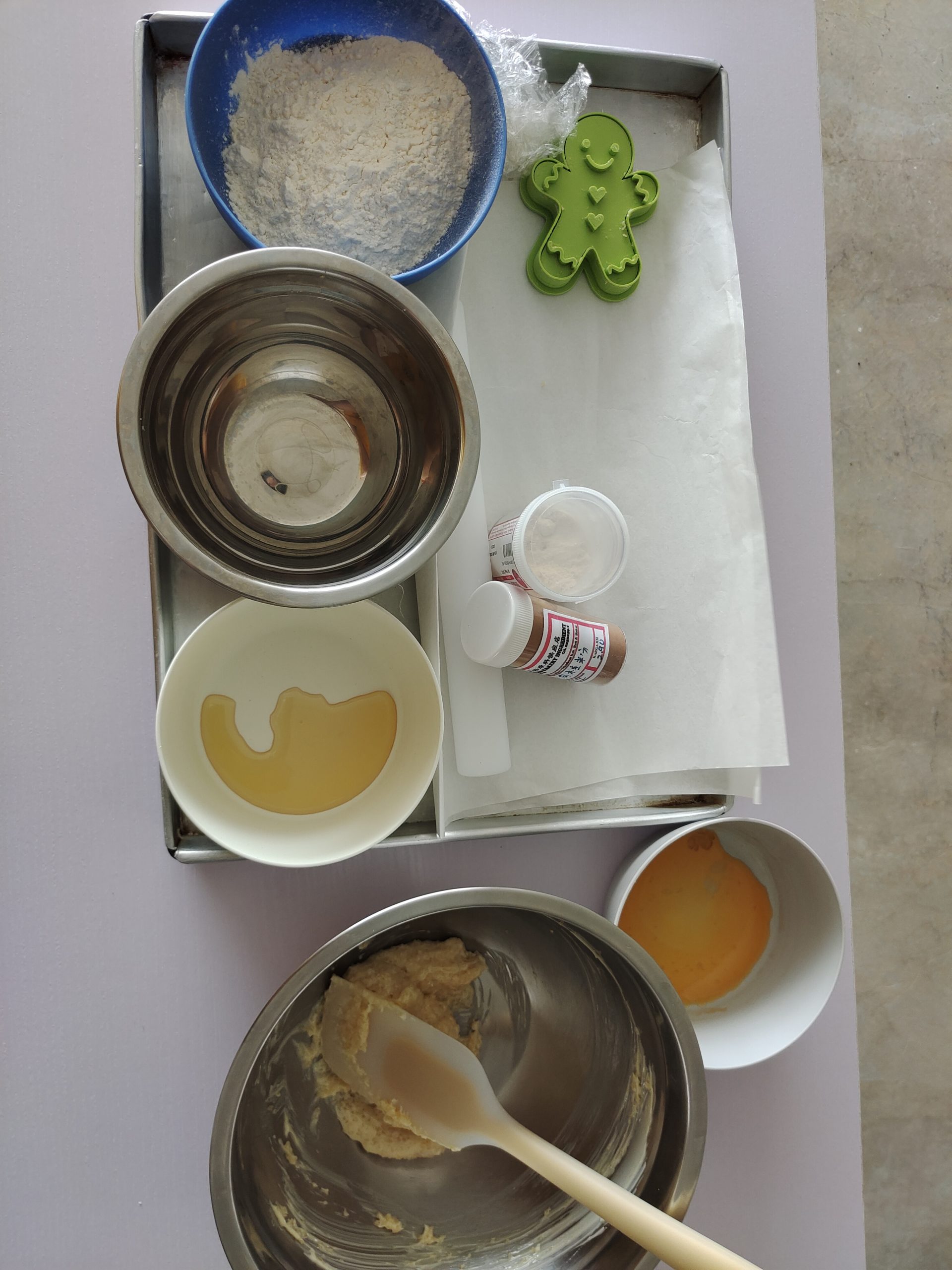 “姜饼人主要材料是普通面粉、软化牛油、鸡蛋、黄糖、蜂蜜、少许肉桂粉和姜粉,混在一起揉成面团。