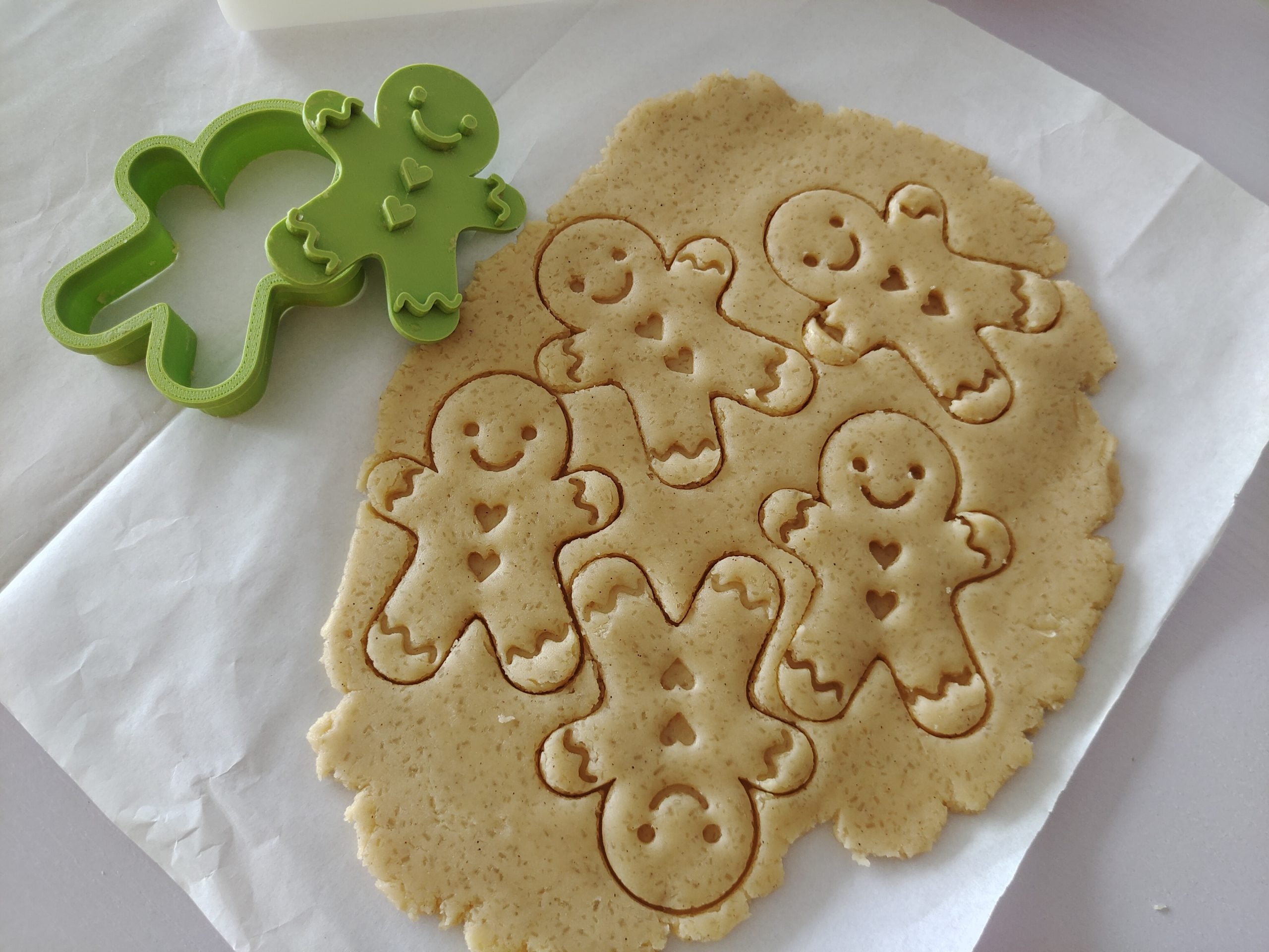 “接着用扞面杖将面团扞成1毫米左右的面饼,用人形模具印出姜饼小人的形状;再放进冰箱冷藏面团20分钟。”