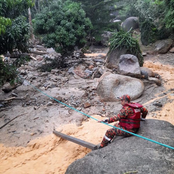 “彭亨州消拯局总部的特别策略救援行动队伍(STORM)也前往施救受困的游客。”