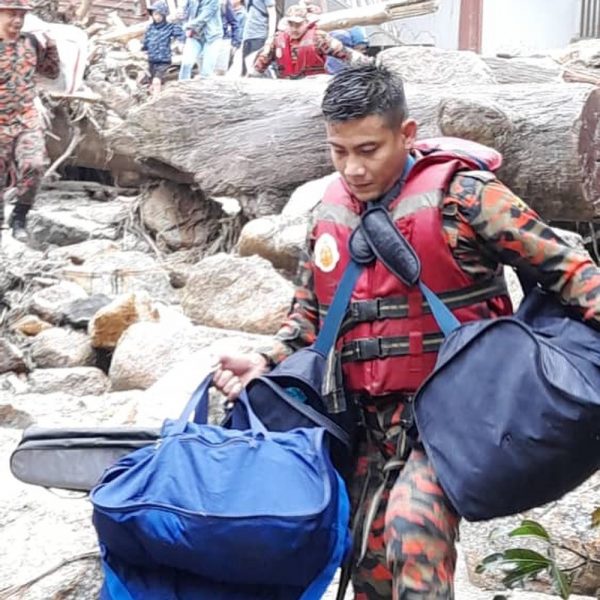 消拯员把游客的行李搬到安全的地方。(取自马新社脸书)