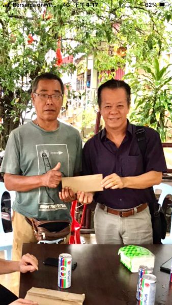 有鉴于此,有关组织决定拨款来协助减轻受灾会员的经济负担,义款已于今天由主席黄金峰移交予灾民代表张国华。