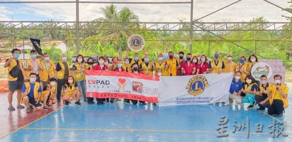 大马狮子会与批发商总会到直凉送暖,参与义工在会上合影。(颜美秀摄)