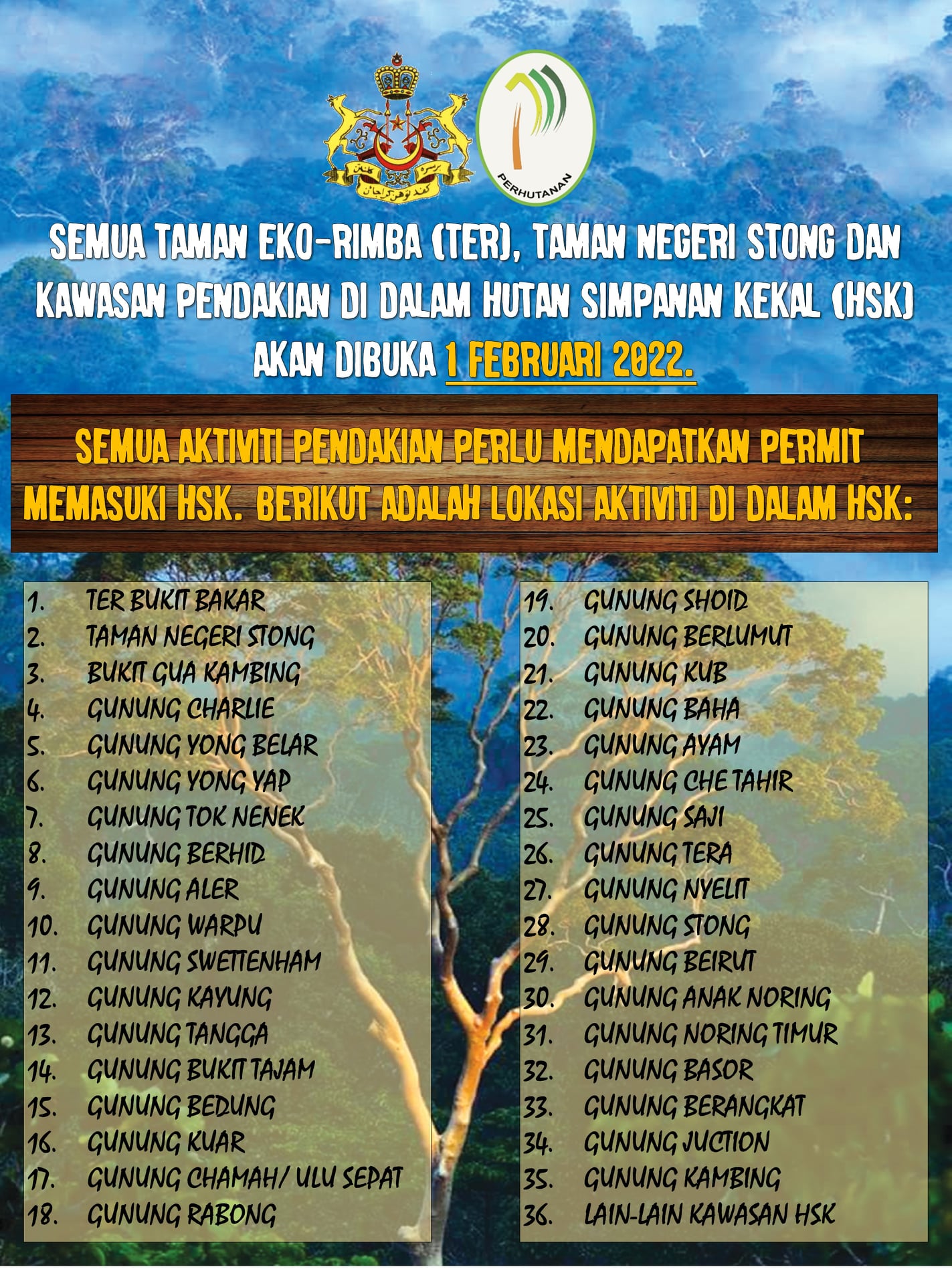 无论如何,丹州森林局已宣布,2月1日起开放州内至少35个生态公园及森林保留地供民众进行登山、露营及越野探险活动,所有访客需持有许可证进入。