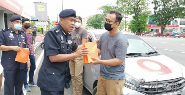 除了对话活动,旺莫哈末查哈里今天中午也率领一众警官及交警来到电召车及送餐员聚集的关丹成功广场大门,向业者派发防范罪案宣传册子及恩物。