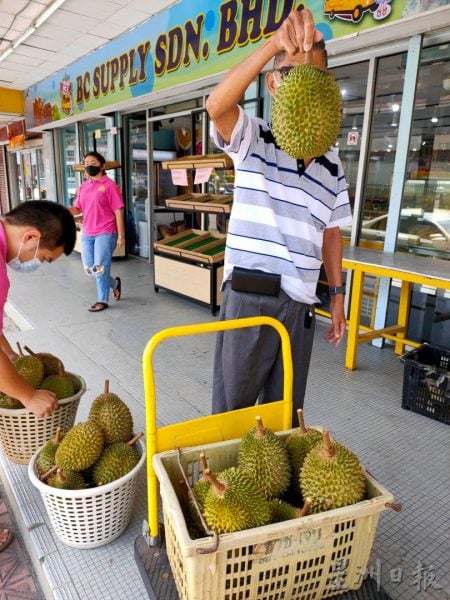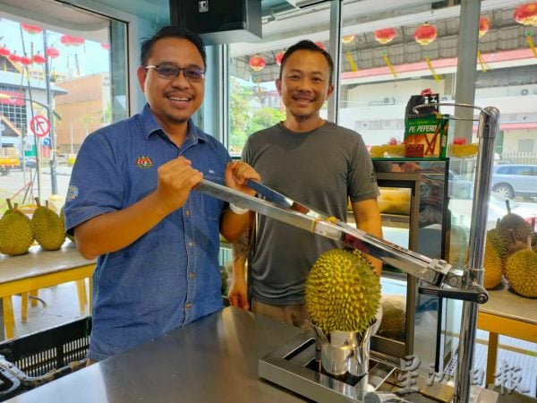 莫哈末艾迪当天也在该店直播网红“德哥”黄祥泰的带领下,以特制的工具体验开榴梿的趣味。该店一天可以销售300公斤的榴梿,吸引不少民众来买榴梿。