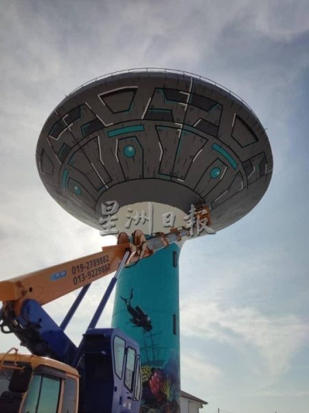 (关丹6日讯)耗时大约两周完成,关丹甘榜柏拉姆峇鲁(Kampung Peramu Baru)大型圆盆水槽化身“幽浮(UFO)”立体壁画,成为关丹目前面积最大及最高的壁画作品。