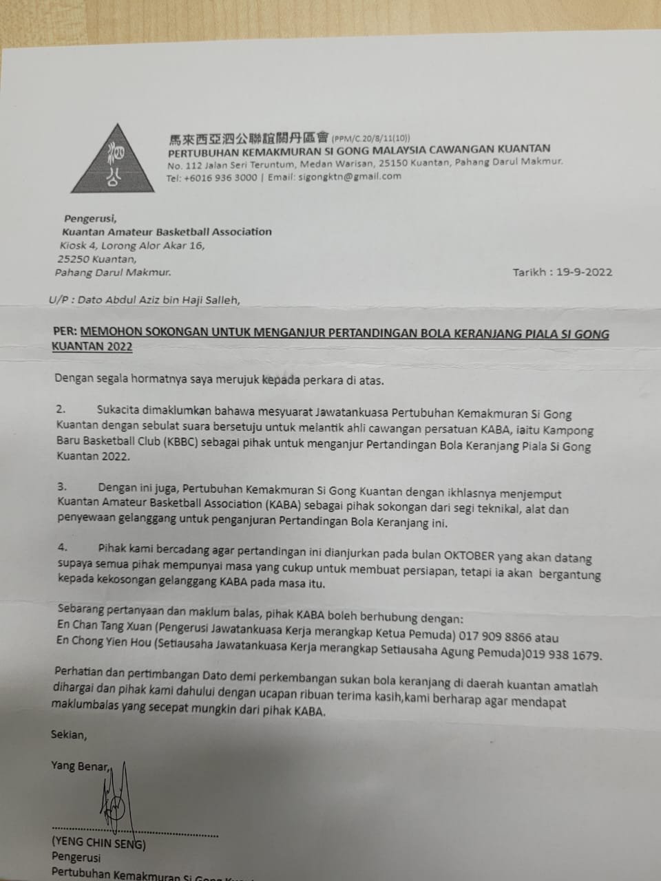 秘书处也出示泗公组织当天呈交的函件指出,依照这份公函,泗公组织表明了要新村篮球俱乐部去承办泗公杯篮球赛。因此照程序,关丹篮总一直等新村篮球俱乐部致函予该会,来协调赛会的场地。直到目前为止都没有一点消息。