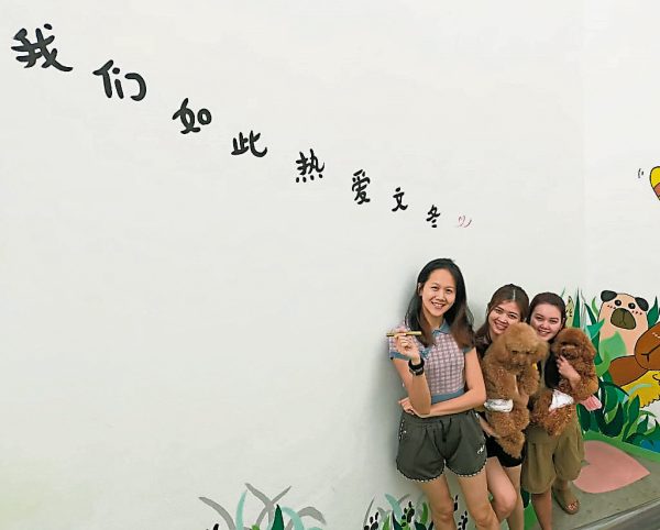 她说,她在宠物咖啡店的楼梯间绘画了粉红色的爱心,也称为心心相印阶梯壁画,还有可爱的猫狗,主要目的是希望吸引人们跟着一颗颗爱心,一步一步走上三楼的宠物咖啡店。