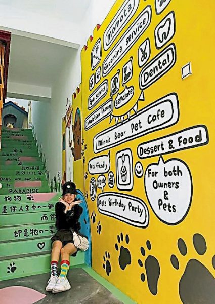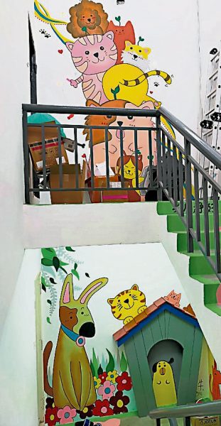 (文冬26日讯)文冬多才多艺的年轻画家黄雪媛为中学一名女同学的宠物咖啡店的楼梯间彩绘可爱猫狗的壁画,顿时引起了爱狗人士的“惊艳”,也成为文冬市区独特的阶梯壁画打卡地点。