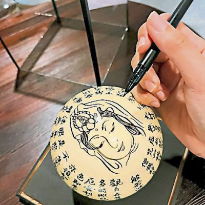 使用鸵鸟蛋绘画是她最近大胆创新之作,她共花了5小时在鸵鸟蛋完成抄写般若波罗蜜多心经,其他还有禅绕画鸵鸟蛋和流体鸵鸟蛋等。