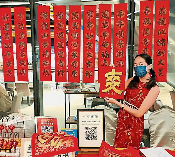 写得一手好书法的她在农历新年期间也在吉隆坡的购物商场设流动柜台现场挥春,传承中华艺术文化。作为新一代创作画家,她写的书法注入了新元素,手绘春联,以及为毛笔字加上金色,成为立体的书法艺术作品,别出心栽。