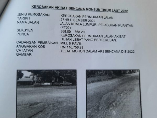 关丹工程局申请7000万令吉拨款 维修关丹逾60区烂路