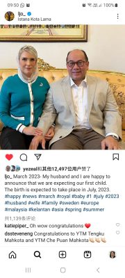 吉兰丹王储东姑莫哈末法依兹布特拉与王储妃苏菲雅宣布,预计在7月份迎接第一个爱情结晶。