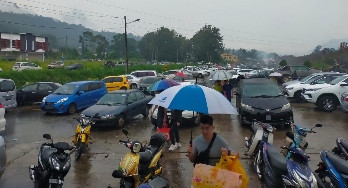 今日清晨6时许,进入两广义山路段出现长长车龙,义山的四周范围也停满车辆,许多民众扶老携幼踩青扫墓,结果突然下大雨,也有许多刚抵达的民众在伯公亭避雨,大约1小时,雨终于停了,众人也都松了一口气,立即拿起纸扎品和祭品朝往墓地进行拜祭。