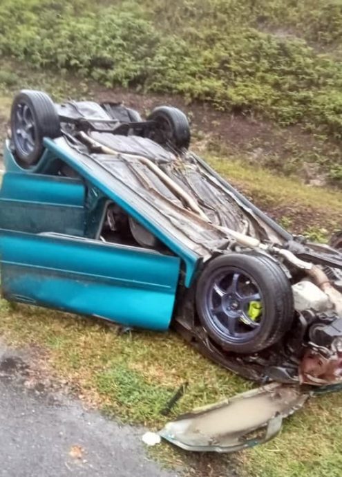 “由拉惹海卡纳兹米驾驶的轿车在意外地点失控翻覆,5人全被夹在车内。”