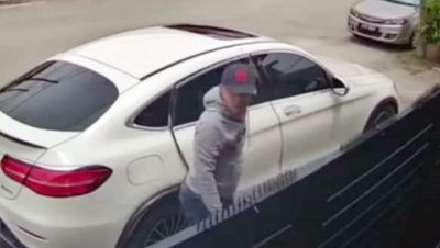画面中显示,一辆白色马赛地来到受害者的住处,故意把车停放在铁门前作为掩体,以阻挡经路过车辆及对面居民的视线。一名戴著黑色鸭舌帽的男子从后座开门下车,在铁门前左右来回探视,当确定屋里没人后就上车。