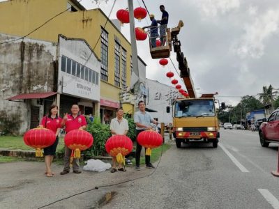 今天陪同徐祥強巡視安裝新春燈籠工作進度的商會理事成員,包括該會妇女組主任谭茵霞、副会长钟今发、理事温繼生。另外,徐祥強披露,該商會將於大年初一晚上8時30分,在三聖宮庙前燃放烟花鞭炮炒熱氣氛,與居民同慶佳節。