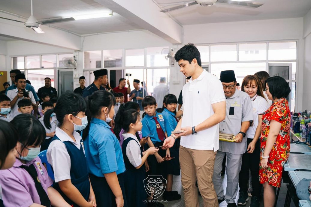 王储东姑哈山纳依布拉欣该校文教史馆参观文物,了解直凉和华校的历史,品茗中国茶和挥春,之后和派发红包给学生,与学生一起制作梅花树和拼贴百福图。