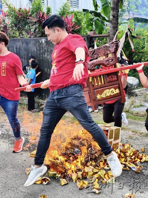 该宫主席颜永隆亲力亲为,率领团队伴着醒狮团、舞龙队、开路人员等沿途敲锣打鼓浩浩荡荡前行。四人一组的抬轿队伍今早一起出巡唐人坡,接受善信膜拜。当地华裔住户在住家门前特设金纸造型,一旦抬轿队伍抵步就点火,膜拜妈祖后神轿跃过火堆,最后折返镇兴宫。