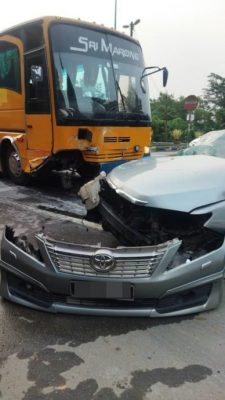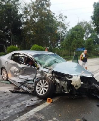 据了解,胡姓男子今日上午7时许载着妻子和妻子的姐姐从万挠欲到文冬吃早餐和游玩,在加叻大道文冬收费站进入文冬三叉路口的小牌楼处,在转右前往文冬时,与一辆从文冬方向而来的学生巴士相撞,整辆车毁不成形。