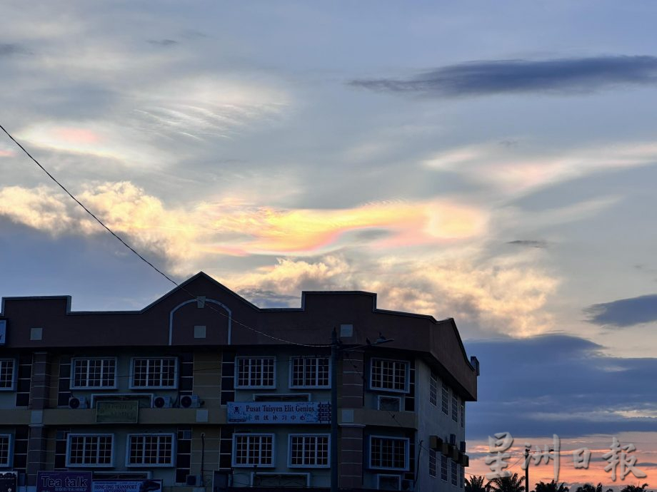 昨日傍晚7时,市民卢丽娟在直凉金相商区(中学对面)拍摄到天空中的罕见景观,只见晚霞融合了粉色、紫色、蓝色、黄色、橘色,五彩缤纷,巧妙得很。