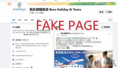 彭亨州百乐假期旅游旅行社销售部负责人蔡国华受访时说,他们在发现有骗子盗用该社名义开设新的专页后,之后也发现国内其他旅行社同样中招,怀疑是同一伙人所为。