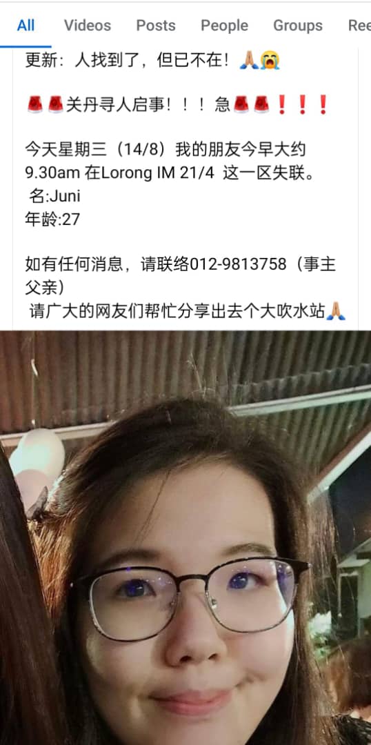 27岁已婚少妇祖妮(译音)被指于今早9时左右送孩子上学,不过之后却再也联系不上,其家人与朋友从社交媒体上发布寻人帖,希望尽快找到人。
