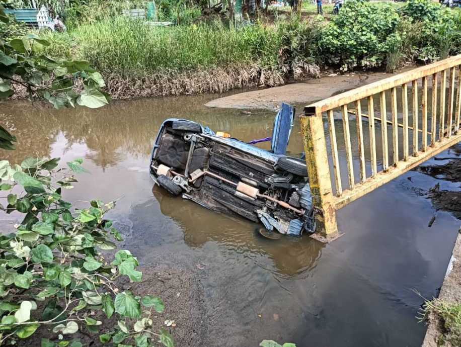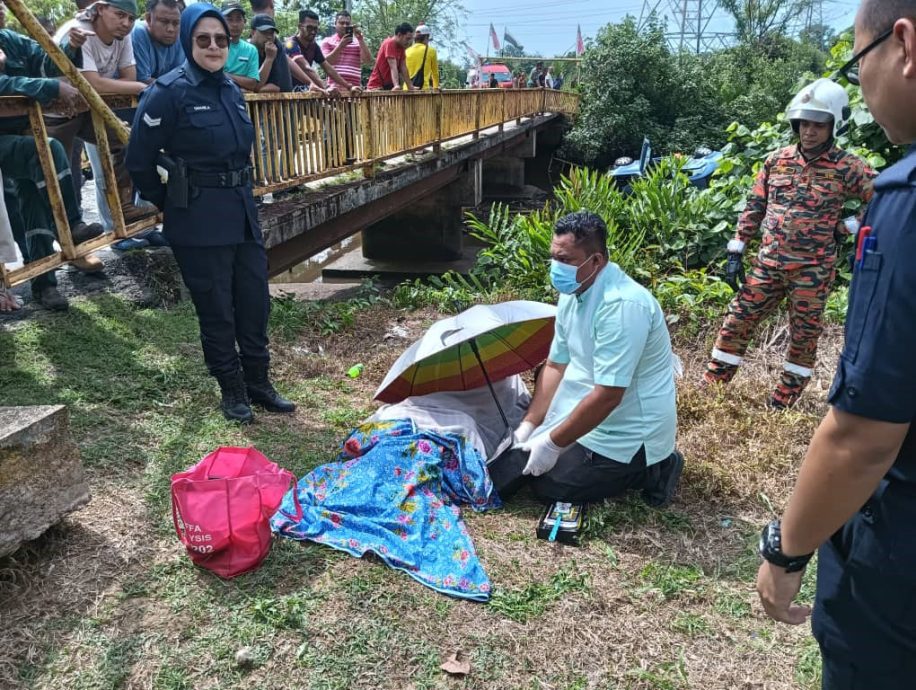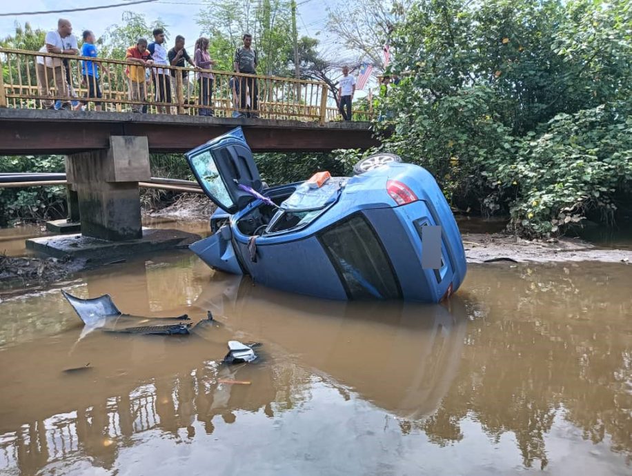(关丹25日讯)轿车失控撞毁巴洛马慕小桥栏杆后坠河,导致67岁马来女司机当场毙命,坐在司机座旁的丈夫则身受重伤,送院经过一番抢救后也宣告不治身亡。
