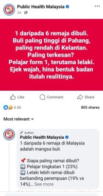 大马公共卫生于本月29日(周二)通过脸书指出,中一学生最常成霸凌者的目标,占比达23%。
