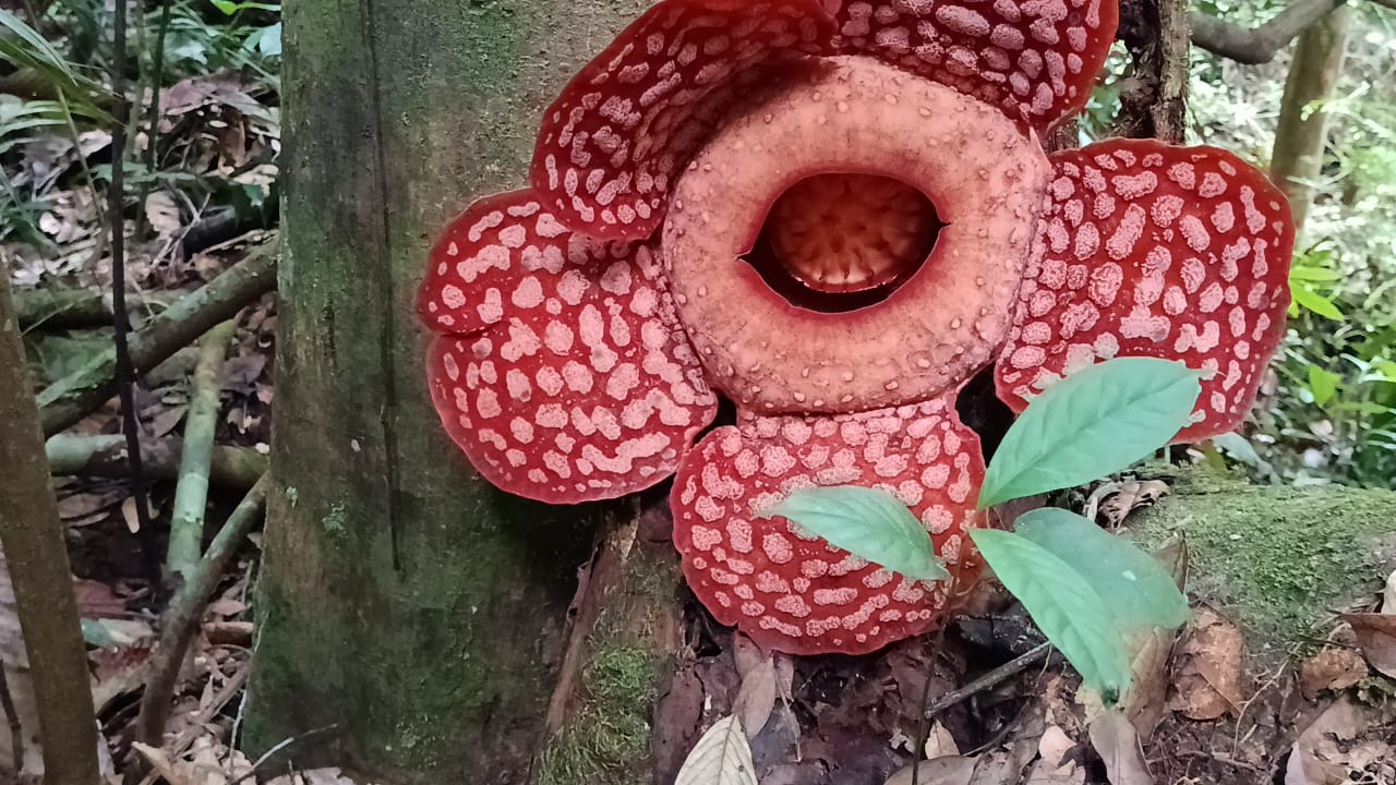 “莱佛士花绽放短短一周便会枯萎凋谢。红橙色巨大的花瓣在森林地面壮丽绽放,花朵直径估计介于25至50厘米之间,景象壮观。”