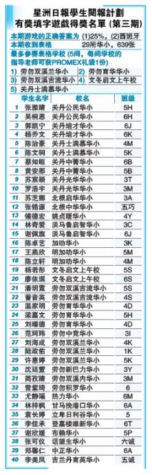学生阅报计划填字游戏 第三期得奖名单出炉