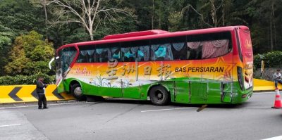 (云顶10日讯)一辆旅游巴士从云顶下山时,在转弯处发生意外,直撞路中分界堤,也殃及一辆轿车和一辆德士。