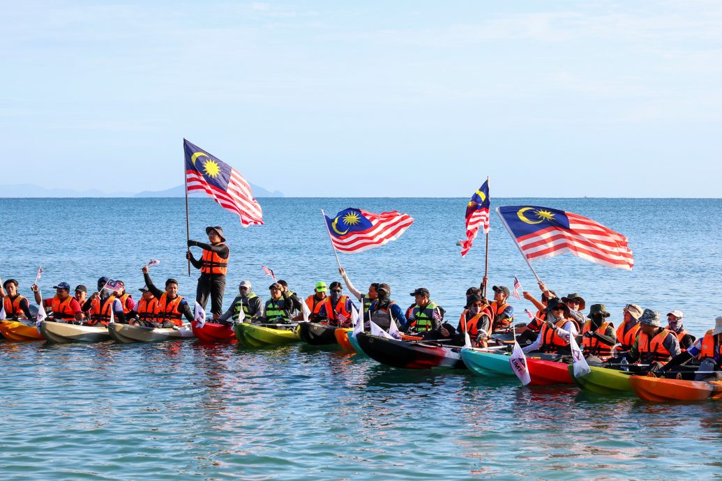 (瓜拉尼鲁斯14日讯)配合国庆日及马来西亚日,东海岸40名大学生与大学职员划独木舟,横渡22公里海程前往比东岛,一路挥舞国旗,展现爱国情怀。