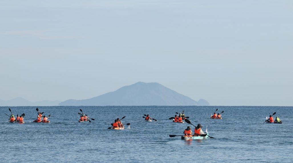划独木舟横渡比东岛 40大学生挥国旗展现爱国