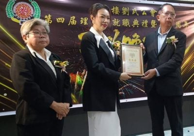 刘慧雯(左)颁发委任状给拿督刘增耐,委任他为登嘉楼刘氏公会顾问。