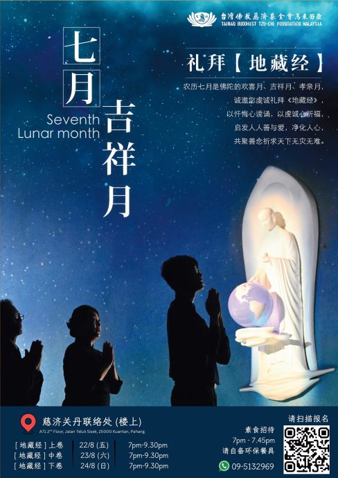 (关丹21日讯)慈济关丹将于8月22日至24日(周五至周日)连续三晚,在关丹联络处(直落丝丝路)举办“2025年七月吉祥月祈福会”,诚邀志工与民众齐聚一堂,虔诵《地藏经》,祈愿人心净化、社会祥和、天下无灾。