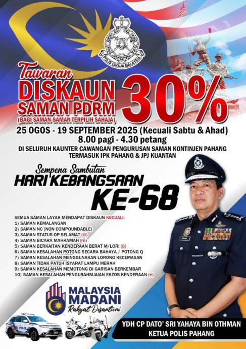 彭亨警方于官方脸书发布国庆月罚单折扣30%消息,从本月25日起至9月19日(除了星期六及星期日),于工作日上午8时至下午4时30分,民众可前往各警局的罚单柜台或关丹陆路交通局柜台,缴付警方罚单以享有折扣。