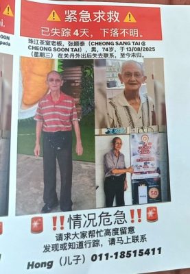 (关丹28日讯)“别误会,请大众继续寻找!”关丹75岁长者张顺泰依然下落不明,但因近日网传一张以“2名75岁老人失踪”的贴图在社交媒体流传,导致部分公众误会,甚至转发“老人已经寻获”的手机简讯。