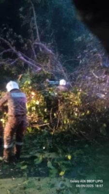 关丹消拯局4名消拯员于7时09分抵达现场,清理并移除倒塌的树枝,确保环境安全。