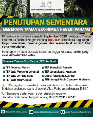 任何疑问,可联系彭亨州森林局:09-573 2911 、2914,或浏览官网:forestry.pahang.gov.my 查询详情。