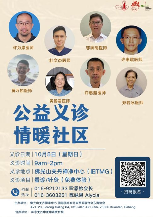 (关丹19日讯)为提升大众的健康意识,并为社区带来更多温暖关怀,佛光山关丹禅净中心联同国际佛光会马来西亚联合会东海协会,将于10月5日(星期日)举办义诊。