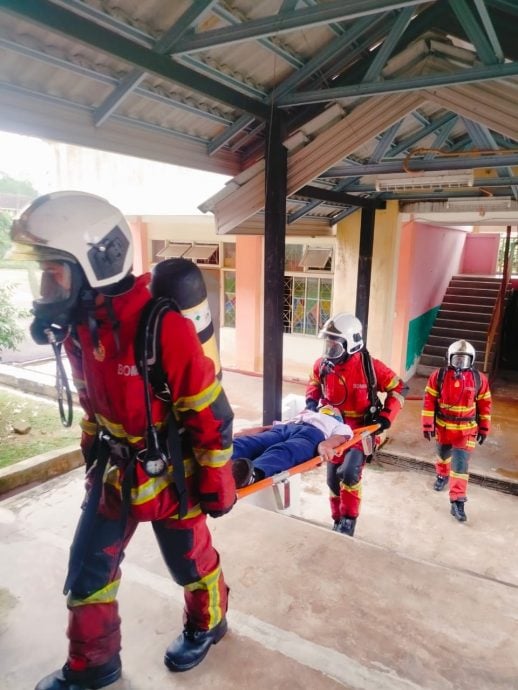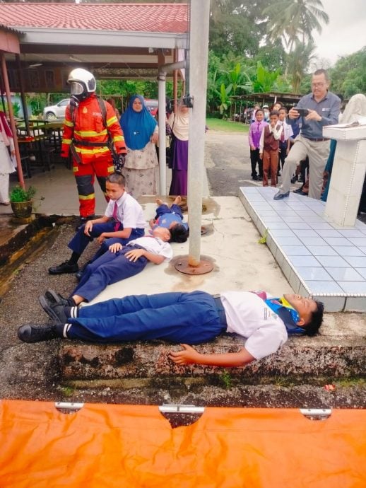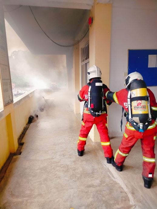 (关丹26日讯)彭亨消拯局珍尼分局到学校进行火灾演习,现场模拟火势与浓烟四起的情景,师生按照指示紧急疏散,消拯人员迅速展开救援,整个场面紧张逼真,如同真实灾情再现。