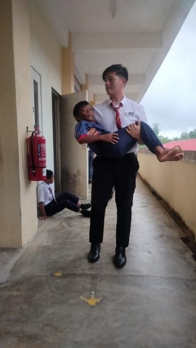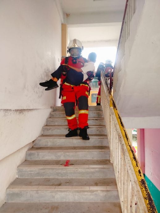 演习还设有“情节”,模拟校舍失火,3名学生受困在建筑物内。师生全力配合“演出”,包括消拯人员与教师合作,将学生从“火场”救出,而学生也在情节中“受伤”倒地,使演习更具真实感。