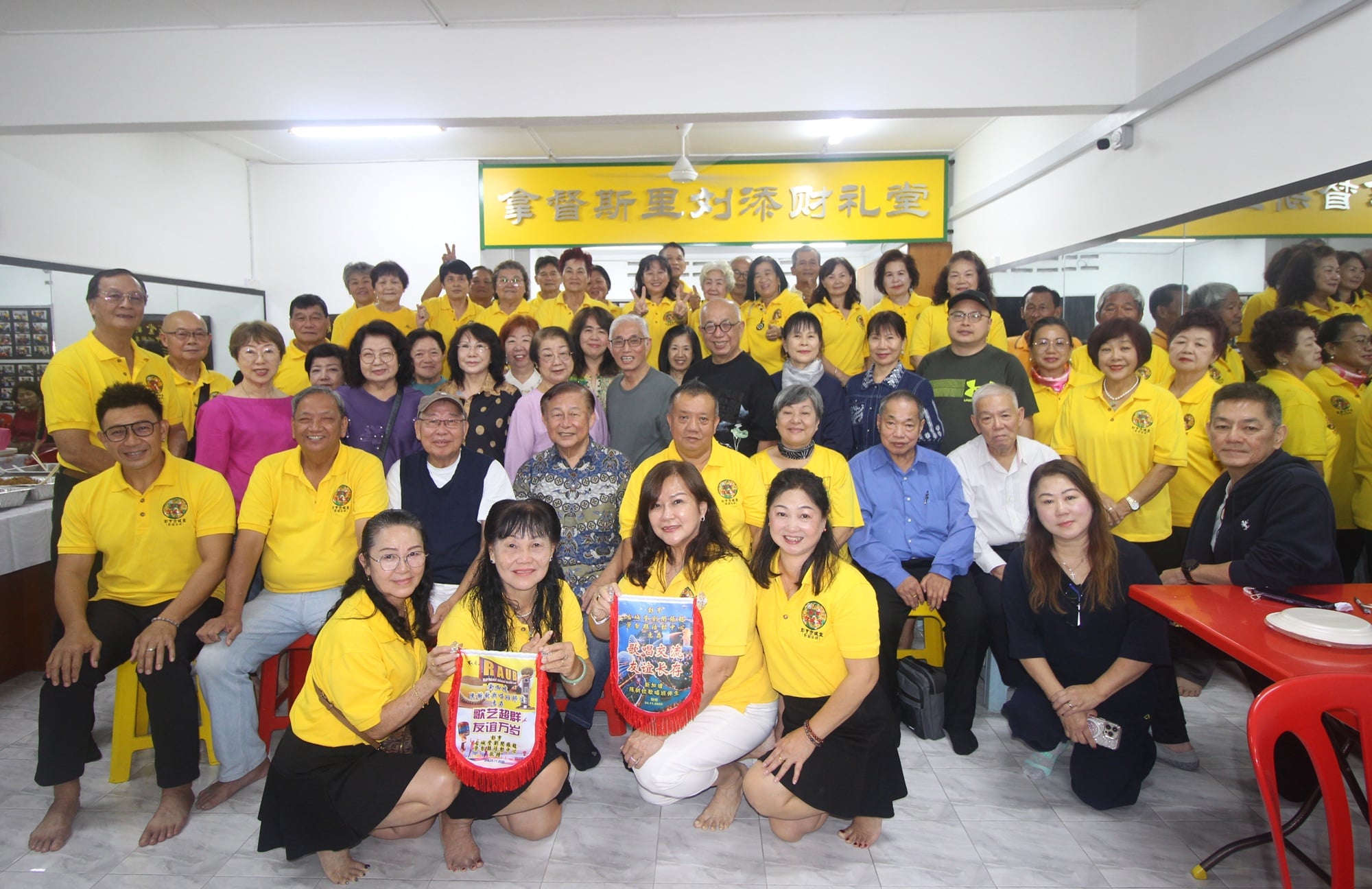 彭亨古城堂劳勿歌唱班与新加坡陈树钦歌唱班一行人合影,坐者左起为陈明辉、林福平、万星、陈树钦与刘宝华等,蹲者左起为刘观凤、江玉凤、陈奕臻及曾瑞芬。(黄正强摄)